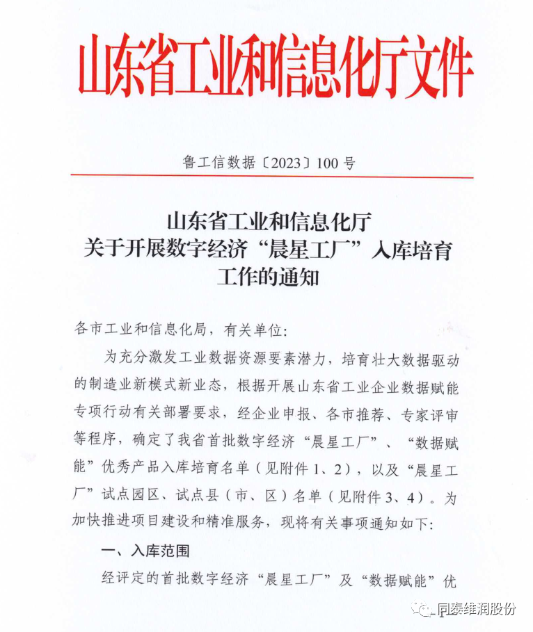 近日,山東省工業(yè)和信息化廳印發(fā)《關(guān)于開展數(shù)字經(jīng)濟“晨星工廠”入庫培育工作的通知》,山東同泰維潤食品科技股份有限公司成功入選。