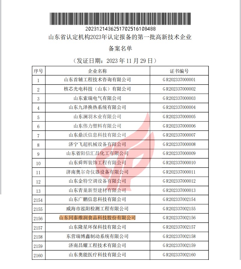 近日,全國(guó)高新技術(shù)企業(yè)認(rèn)定管理工作領(lǐng)導(dǎo)小組辦公室公示了山東省認(rèn)定機(jī)構(gòu)2023年認(rèn)定報(bào)備的第一批高新技術(shù)企業(yè)名單,山東同泰維潤(rùn)食品科技股份有限公司再次通過(guò)認(rèn)定,被授予“國(guó)家高新技術(shù)企業(yè)”稱號(hào)。